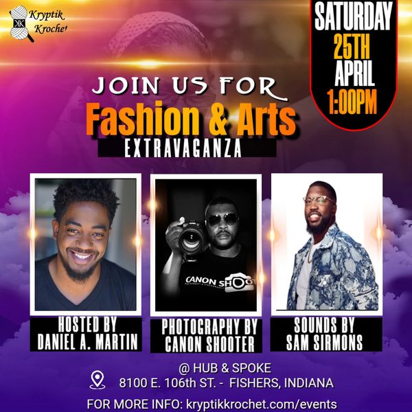 Kryptik Krochet's Fashion & Arts Extravaganza is an exciting fashion show and vendor market taking place on Saturday, April 25, 2026, at Hub & Spoke in Fishers, Indiana. The event will kick off with a vendor market featuring small business owners from the arts, beauty, and wellness industries. Following this, the fashion show will showcase talented designers from around the globe. Stay tuned, as tickets for this exciting Kryptik Krochet event will go on sale MARCH 1st!